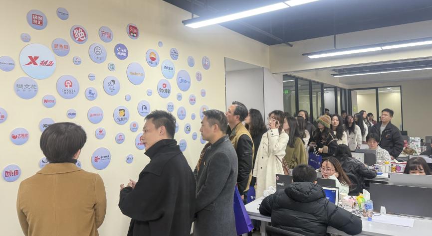 11月28日,湖北大学艺术与设计学院赴武汉文创大厦开展“党旗飘扬强实践,一融双高促发展”主题党日活动,实地走访文创类企业并开展深度交流。湖北华商文化创意产业有限公司总经理谭勇、运营经理余玉岩、武汉昌创智成管理咨询有限公司总经理陈桂丽、武汉仓藤传媒有限公司人事经理张凯文,湖北大学艺术与设计学院党委书记叶秀娟、党委副书记谈玉婷、副院长潘锋、视觉传达与产品设计系教工党支部书记刘卷、支部党员教师和研究生党员代表等参加活动。