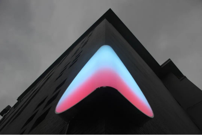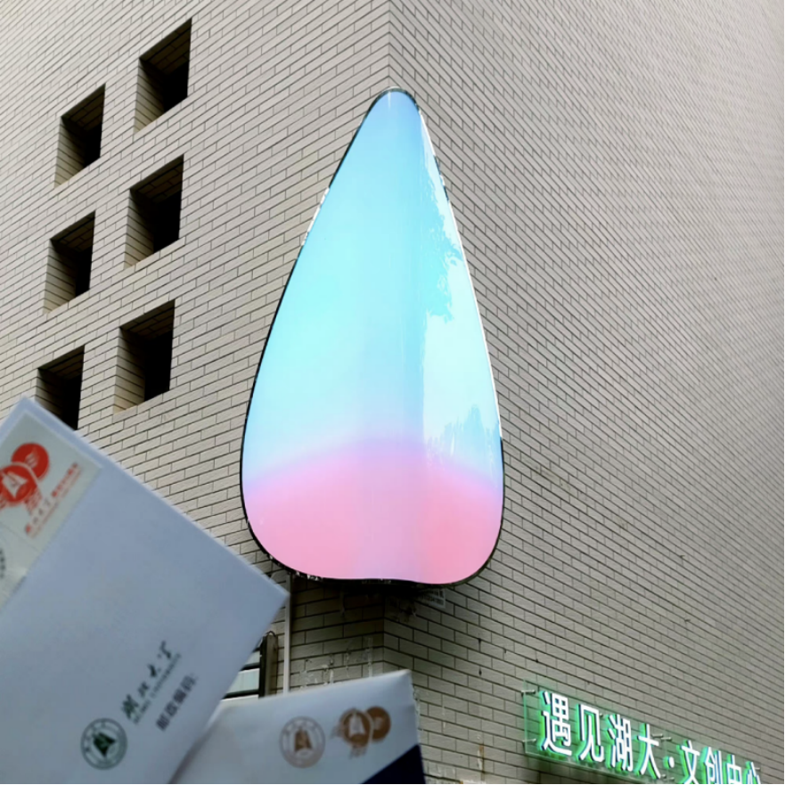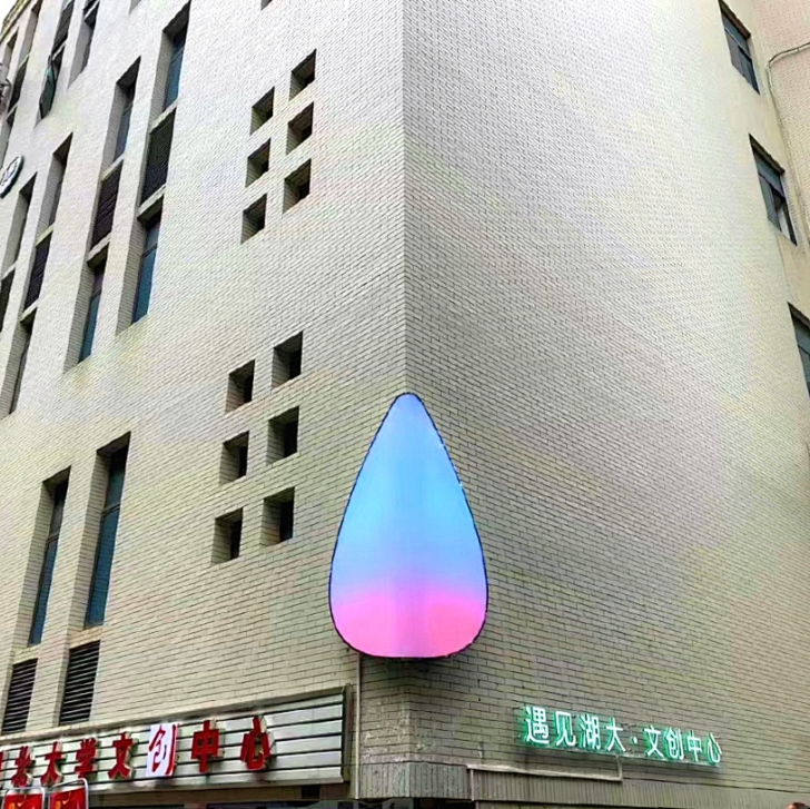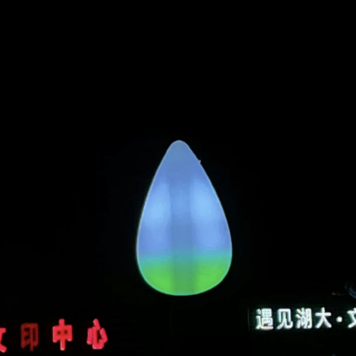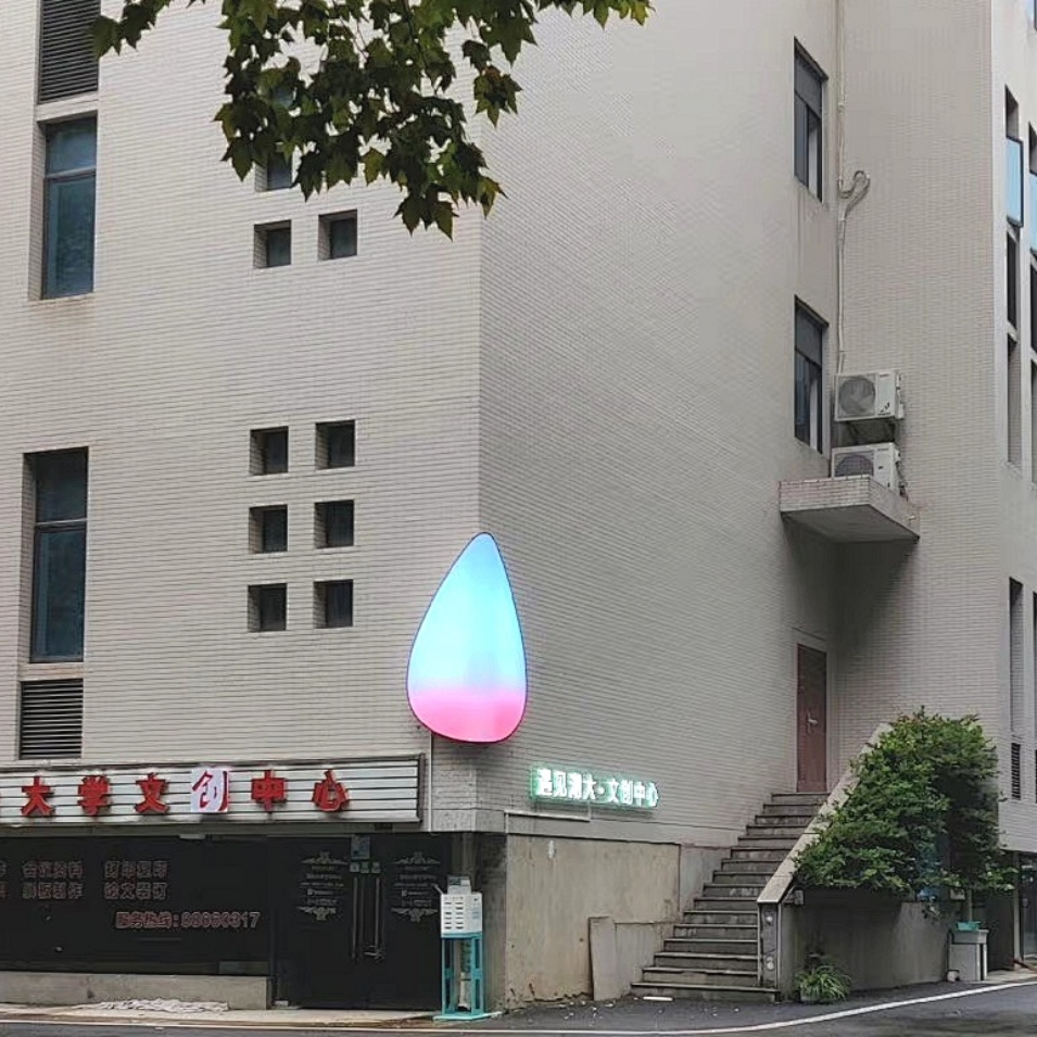 逸夫楼是一个90度的拐角,墙是立体的,把“水滴”放上去就是平面的,而晚上看就没有折痕,产生视觉错位,在下方看又是心型的,角度不同出来的结果不一样。