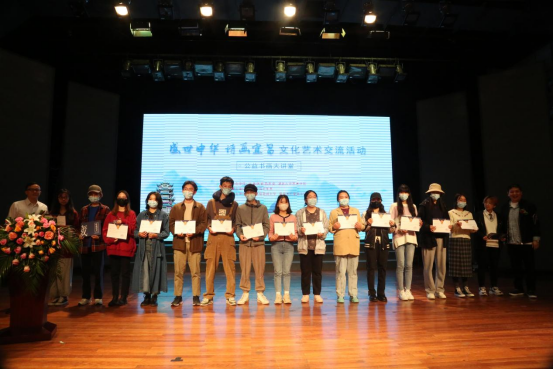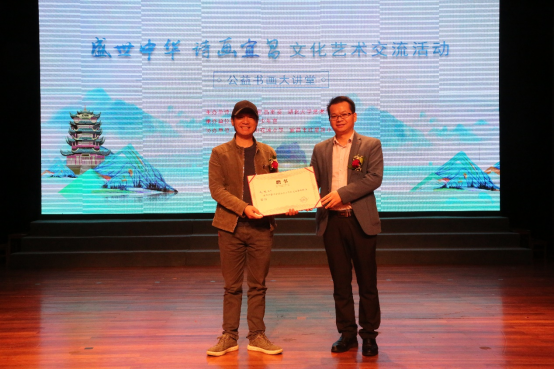 讲座结束后,宜昌市青少年宫副主任韩波、副主任周佳为我校艺术学院大学生参展作品中的十五幅最佳作品颁发“收藏证书”。宜昌市青少年宫主任田明政为马新平教授、杨帆教授、邓鸿涛副教授等书画家们颁发了“宜昌市青少年宫艺术教育顾问”聘书。