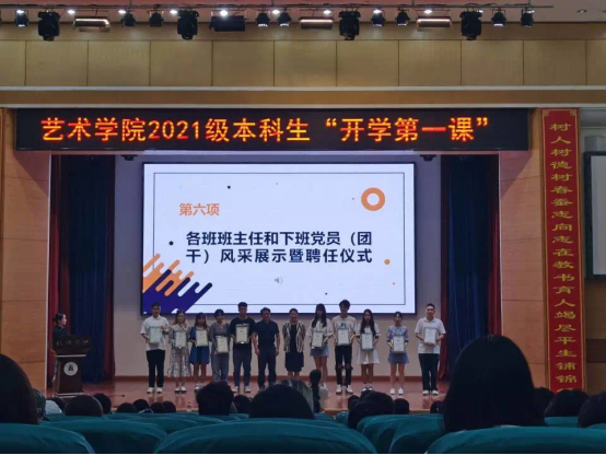 在全场新生的阵阵掌声中,主持人通过大屏幕展示了新生班主任和下班党员(团干)的风采,以及他们送给新生的寄语。院党委书记叶秀娟、院长许开强为十位下班党员(团干)颁发了聘书。