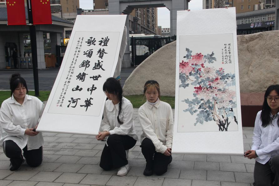在升旗仪式现场,院团委书记许诩、2020级美术学苏晓雅同学以国庆期间创作的书画作品喜迎中华人民共和国成立74周年,文学院师生代表带来的《我爱你,中国》诗歌朗诵则为国旗下的思政课画上圆满句号。在一字一画、一腔一调之间,两个学院的师生不仅用实际行动表达了对中华文化的热爱和对传统艺术的尊重,更表达了对祖国母亲繁荣昌盛的衷心祝福。
