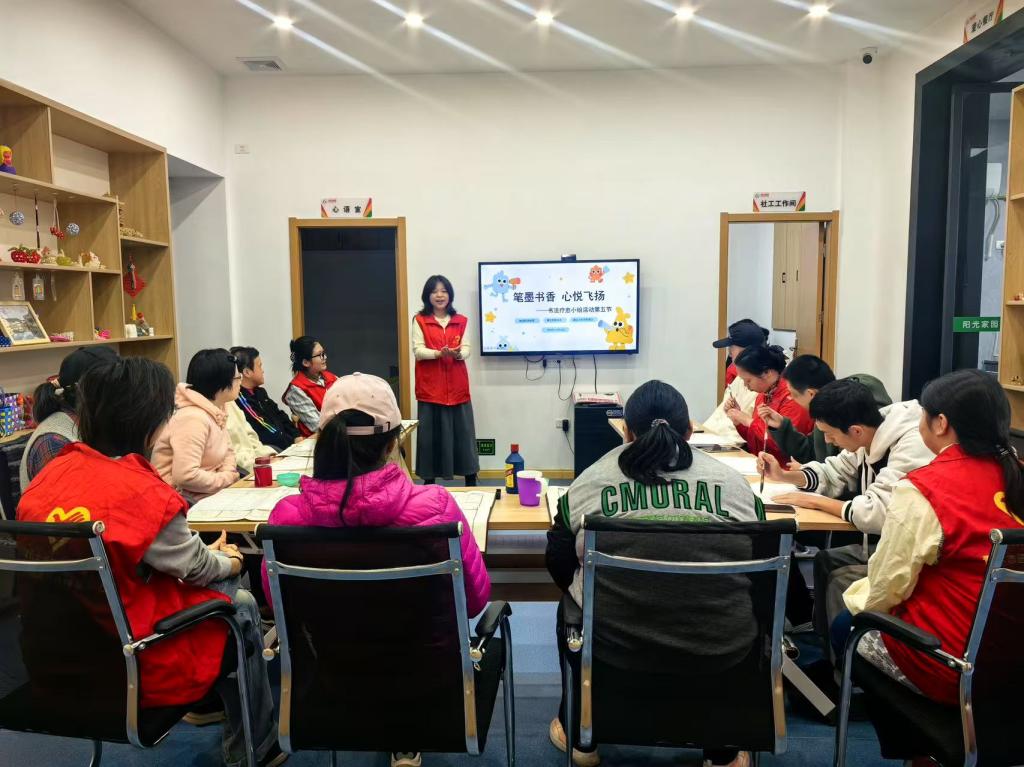 书法作为中华传统文化的瑰宝,不仅承载着深厚的历史底蕴,更具有独特的艺术疗愈功能。在为期六次的活动中,志愿者们通过耐心细致的指导,带领粮道街阳光家园的学员们从握笔、运笔到书写基本笔画,逐步体验书法的魅力。学员们在一笔一画中感受墨香,在静心书写中舒缓情绪,书法成为他们表达情感、疗愈心灵的桥梁。