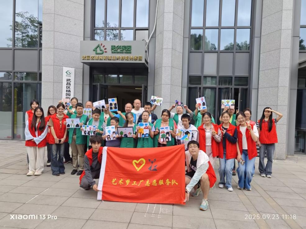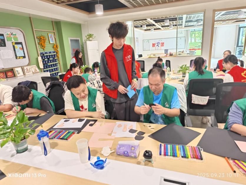 秋分时节,天高气爽。在武汉市阳光街阳光花园社区一间洒满阳光的活动室里,没有喧嚣,只有画笔与纸张摩擦的沙沙声和偶尔迸发的欢声笑语。2025年9月23日上午,湖北大学艺术与设计学院的志愿者们用色彩和耐心,带领一群特殊的“艺术家”,将秋日的静美与内心的丰盈定格在一幅幅画作中。