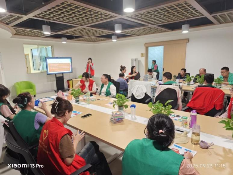 活动伊始,志愿者们采用了“一对一”的贴心陪伴模式。他们不仅是小老师,更是耐心的倾听者和协助者。对于行动不便的参与者,志愿者会细心帮其固定画纸、调换颜料,并用生动的语言描述秋日的色彩与形态,引导他们去感受不同形状的树叶模型,用心去“看见”秋天。在创作过程中,志愿者们也适时介绍垃圾分类知识,例如将落叶归类为厨余垃圾,废弃画笔、颜料包装等归类为其他垃圾或可回收物,让环保理念在轻松互动中深入人心。