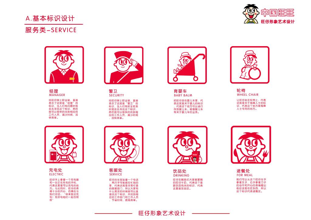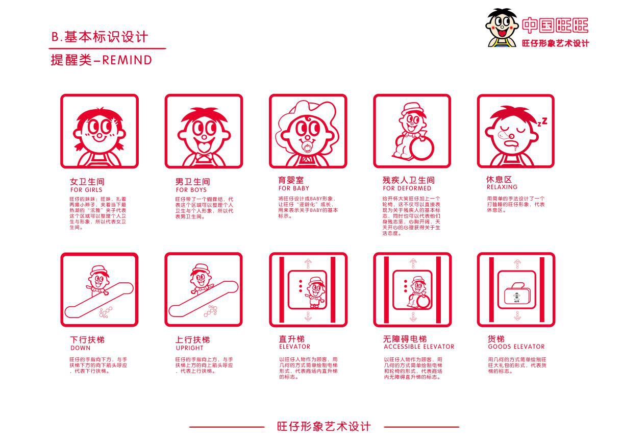 这个作品是使用了旺旺原本的标识作为基本原型,再对其进行抽象化、国际化,并再创造再设计使其成为完整的一套标识系统。