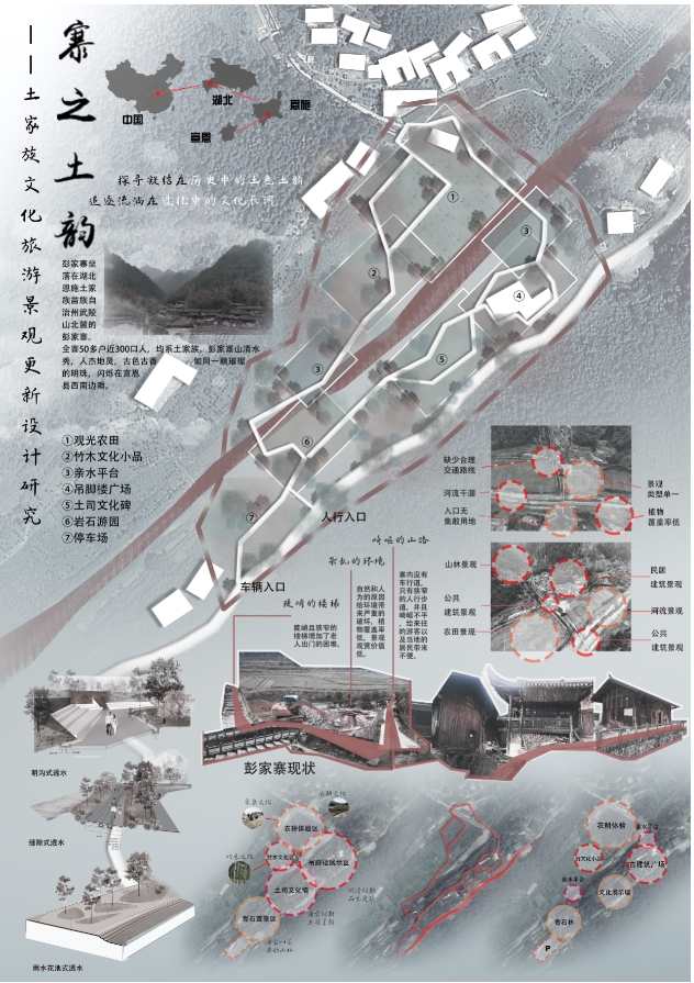 本次设计的政策背景是湖北省“擦亮小城镇”建设美丽城镇三年行动(2020-2022年)。设计的地址位于鄂州市泽林镇。本次设计在经过多次田野调查后,对当地提出了:“景观修复”“建筑外立面修复”“集贸市场改造”“大货车改道”四个维度的改造方案。