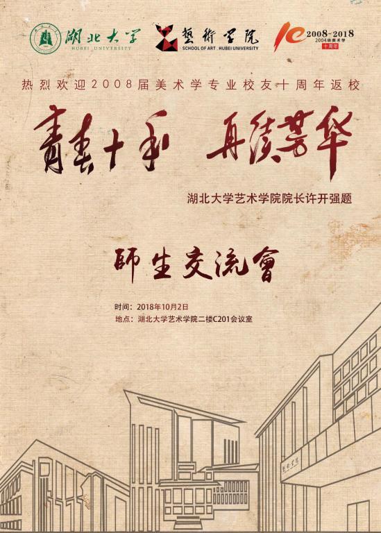 湖北大学学生工作处处长刘靖君对各位校友们来到母校过国庆表示了欢迎,他认为大家青春依旧。在谈到他和学院的缘分时,他说到08届的学生是他所接触的第一批艺术学院学生。他十分怀念在艺术学院的时光,能够被艺术的情趣所感染,受益颇多。所以希望同学们也能珍惜同学、老师之间的缘分,多联系、多接触,也是一个共同成长的过程。刘处长认为湖北大学这些年的发展,艺术学院发展最快,走在了湖北省的前列,学科建设、领导班子起到了举足轻重的作用;08年时学院尚处于起步阶段,经历十年的发展而日趋善,欢迎大家回来重新拜师学艺;他同时表示:十年很短,心不会变,期待下个十年再续芳华。